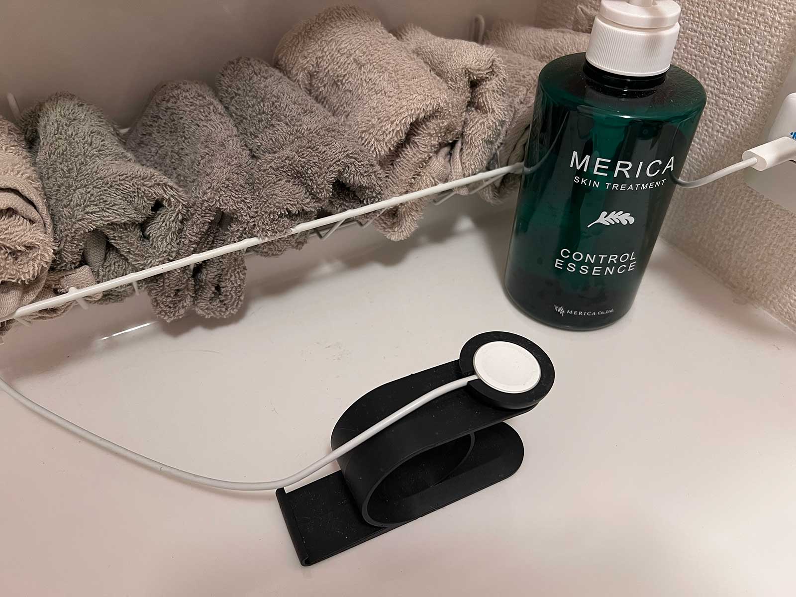 特にお風呂に入る前にApple Watchを外す脱衣洗面所には元々充電器を用意していたので、TORRAS FlashEye For AppleWatch充電器も脱衣洗面所のコンセントで使ってみました。