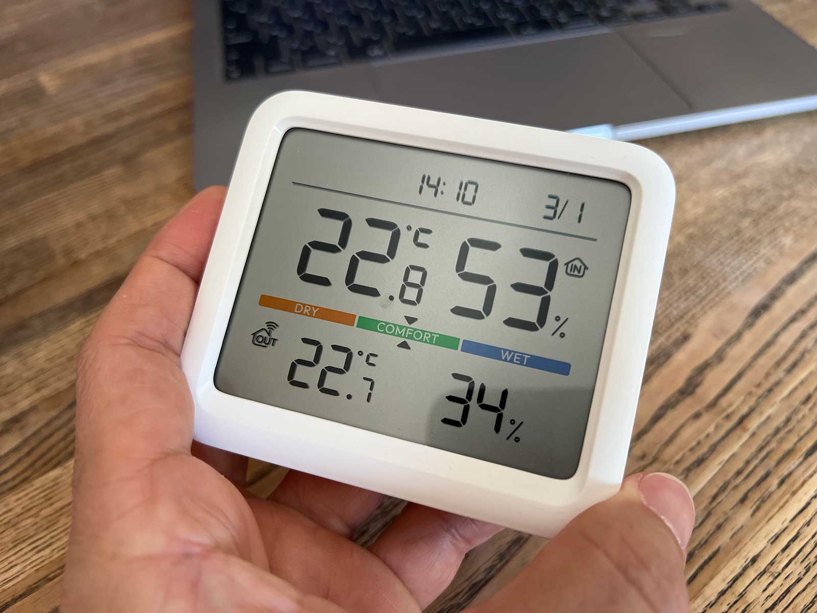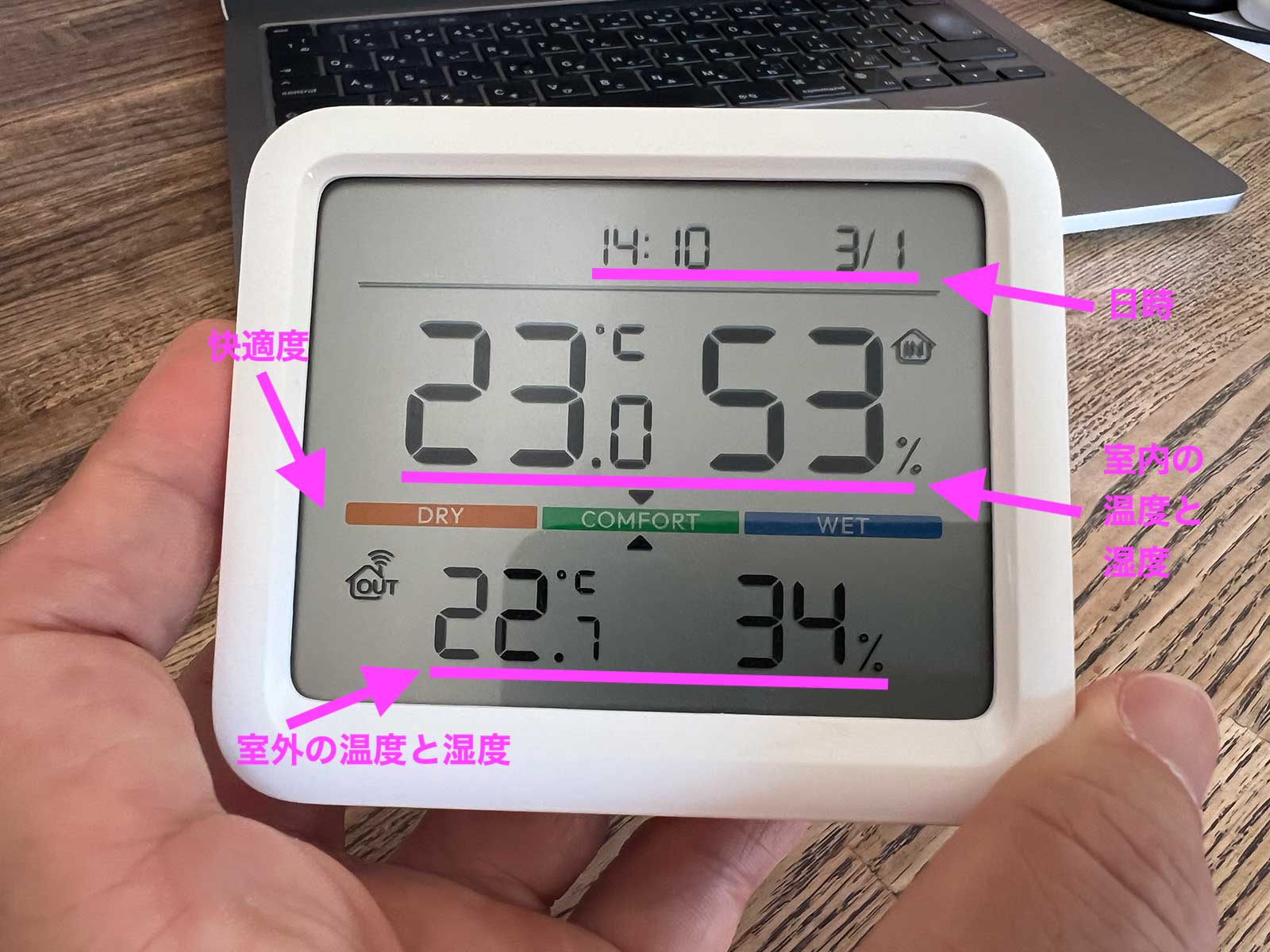 室内と室外の温度と湿度、日付と時間、あと「DRY」「COMFORT」「WET」の3つの状態で快適度を指し示してくれます。