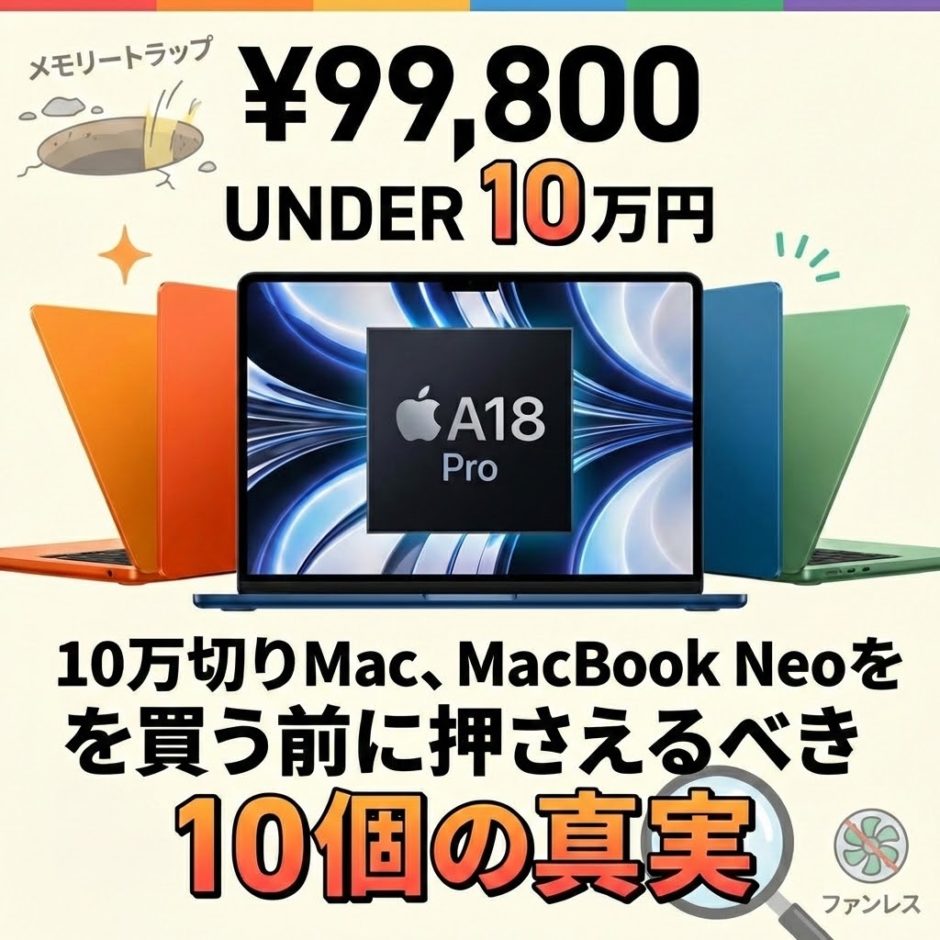 2026年3月、Appleが放った衝撃の一手。それがMacBook Neoです。税込99,800円という、Macとしては異例の「アンダー10万円」を実現したこのマシン。